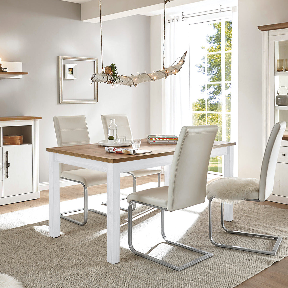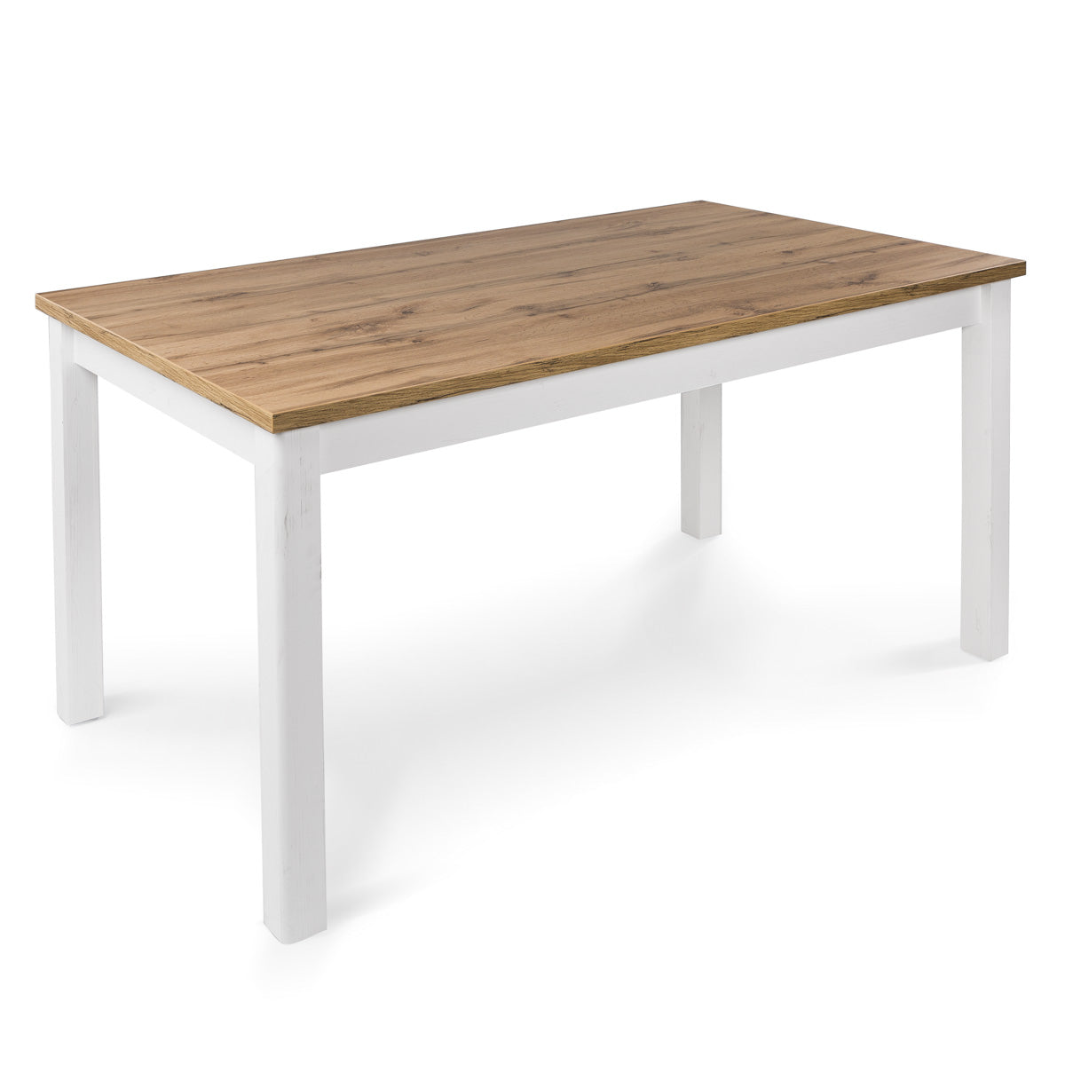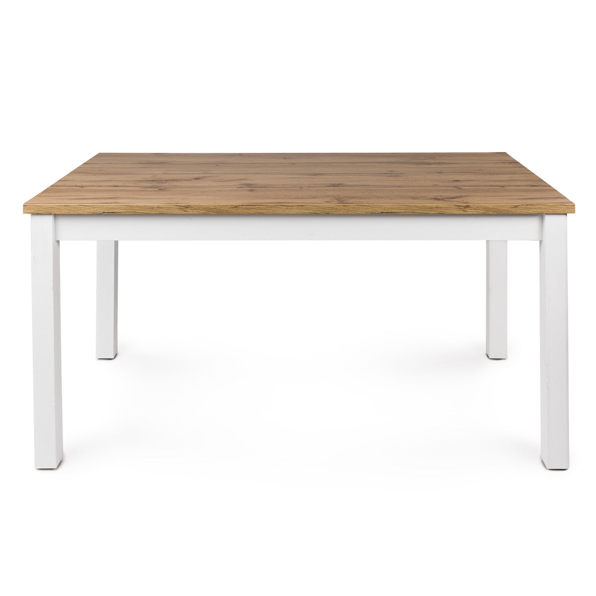 - Taula de menjador fixa en acabat texturitzat amb potes de color blanc Artic i tapa de color roure Aristan.